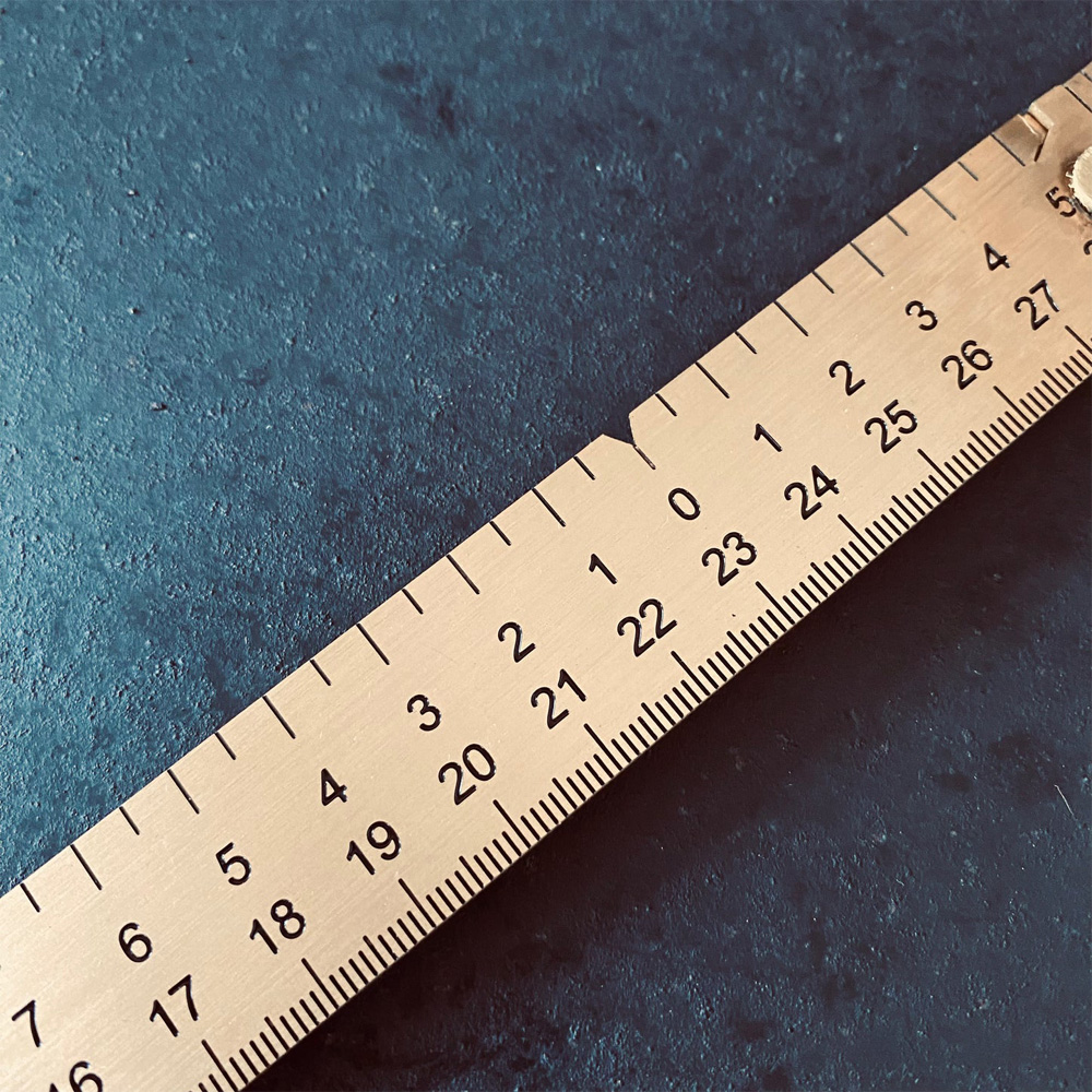 Mätning: Välj millimeter eller inch – skalorna löper parallellt för snabb jämförelse av mått.