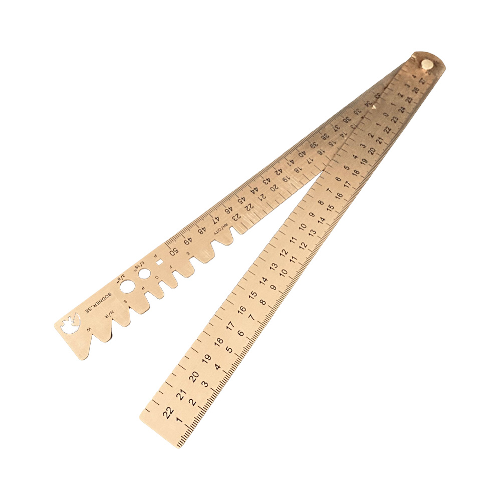 Mångsidig mässingslinjal för hovslagare och smeder med mm/inch-skala, mittmarkering och inbyggda mallar för slipning av smidesverktyg.