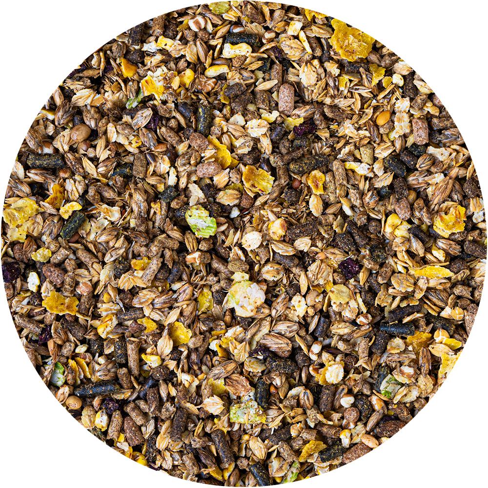 Havreskaldelar, korn, lusern, vetekli, rapskaka, sojabönor (NON-GMO), majsmjöl, majs, ärtor, extruderat linfrö, puffat korn, rapsolja, åkerbönskaldelar, betfiber, rödbetsflingor, dumosweet, cikoria.